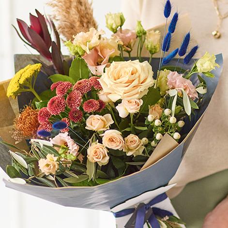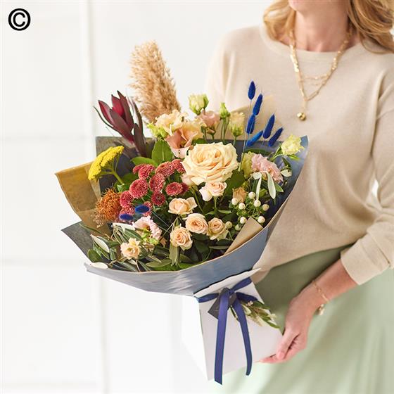 This handcrafted trending bouquet made by a local florist, will feature gorgeous blooms, foliage and dried flowers in muted colours like terracotta or silvery green.