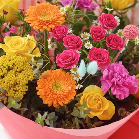 The freshest blooms in vibrant summer colours, exquisitely arranged by a local florist. it'll feature fresh flowers in shades of cerise, saffron and tangerine with pops of blue. It includes at least four yellow roses and you might also see painted or dried foliage.