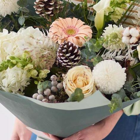 A striking bouquet of fresh and dried flowers in crisp, clean colours, chosen and arranged by the florist.