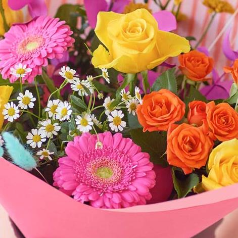 The freshest blooms in vibrant summer colours, exquisitely arranged by a local florist. it'll feature fresh flowers in shades of cerise, saffron and tangerine with pops of blue. It includes at least four yellow roses and you might also see painted or dried foliage.