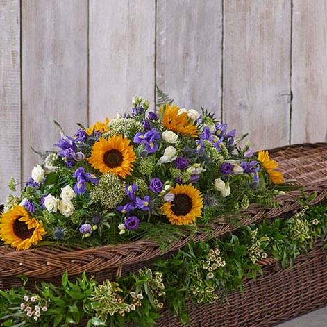 A beautiful combination of our Sunflower Mix Casket Spray, featuring vibrant sunflowers and irses, with a lush foliage garland dotted with dainty waxflower.
