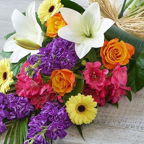 A bright, beautiful and fragrant combination of lilies, roses and stocks. Also featuring alstroemeria and aspidistra.