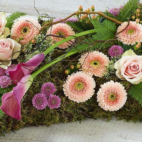 A contemporary design with a woodland feel, this unique pillow posy features pink and peach blooms and willow on a bed of moss.